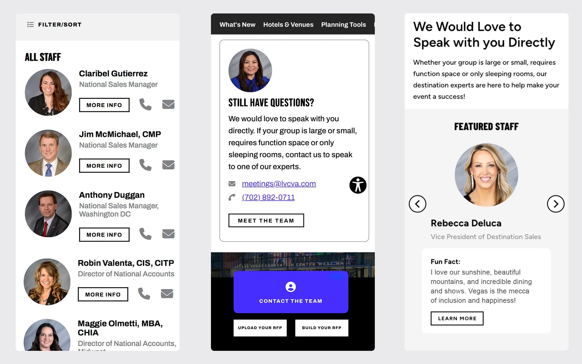 An easy way for a planner to find which team member they needed to contact by filtering by industry and sales region. The Visit Las Vegas sales team is very robust with multiple departments based on industry and location. A meeting planner has the option of over two dozen Las Vegas team members to decipher and choose from. In collaboration with our lead developers, we created a comprehensive contacts list that is filterable by industry, type of event, and geographical location. It also offers pop up for bio and contact info.